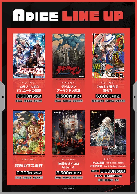 本作はゲームマーケット2025秋において、ADICEブース(エリアA-44)と、マーダーミステリーブースでの販売を予定しています。いずれのブースでお買い上げいただいた場合にも、購入特典として「特大アクリルキーホルダー」(非売品)をプレゼントいたします。