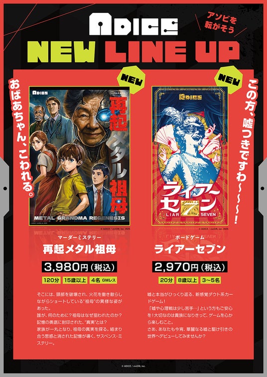 アナログゲームレーベル『ADICE』(運営:株式会社viviON、所在地:東京都千代田区、代表:明石耕作)は、11月22日(土)、23日(日)に幕張メッセで開催されるアナログゲームのイベント・ゲームマーケット2025秋に出展いたします。