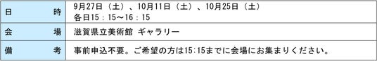 本展先の滋賀県立美術館では、展示室でも静かにする必要はなく、お話しをしながらご覧いただけます。また、目が見えない、見えづらいなどの理由でサポートや展示解説をご希望される場合や、その他、ご来館にあたっての不安をあらかじめお伝えいただいた際には、事前の情報提供や当日のサポートのご希望に、可能な範囲で対応します。