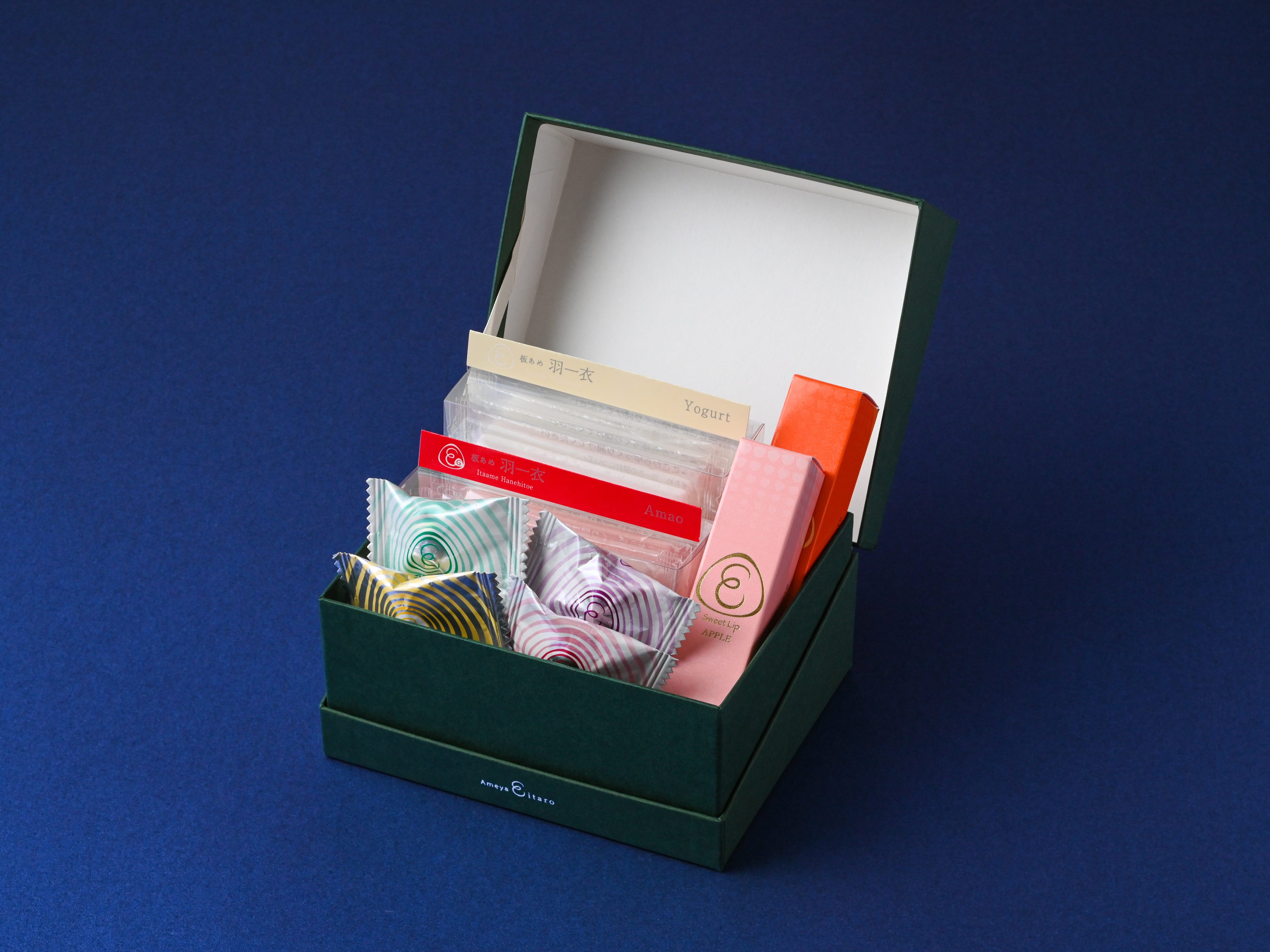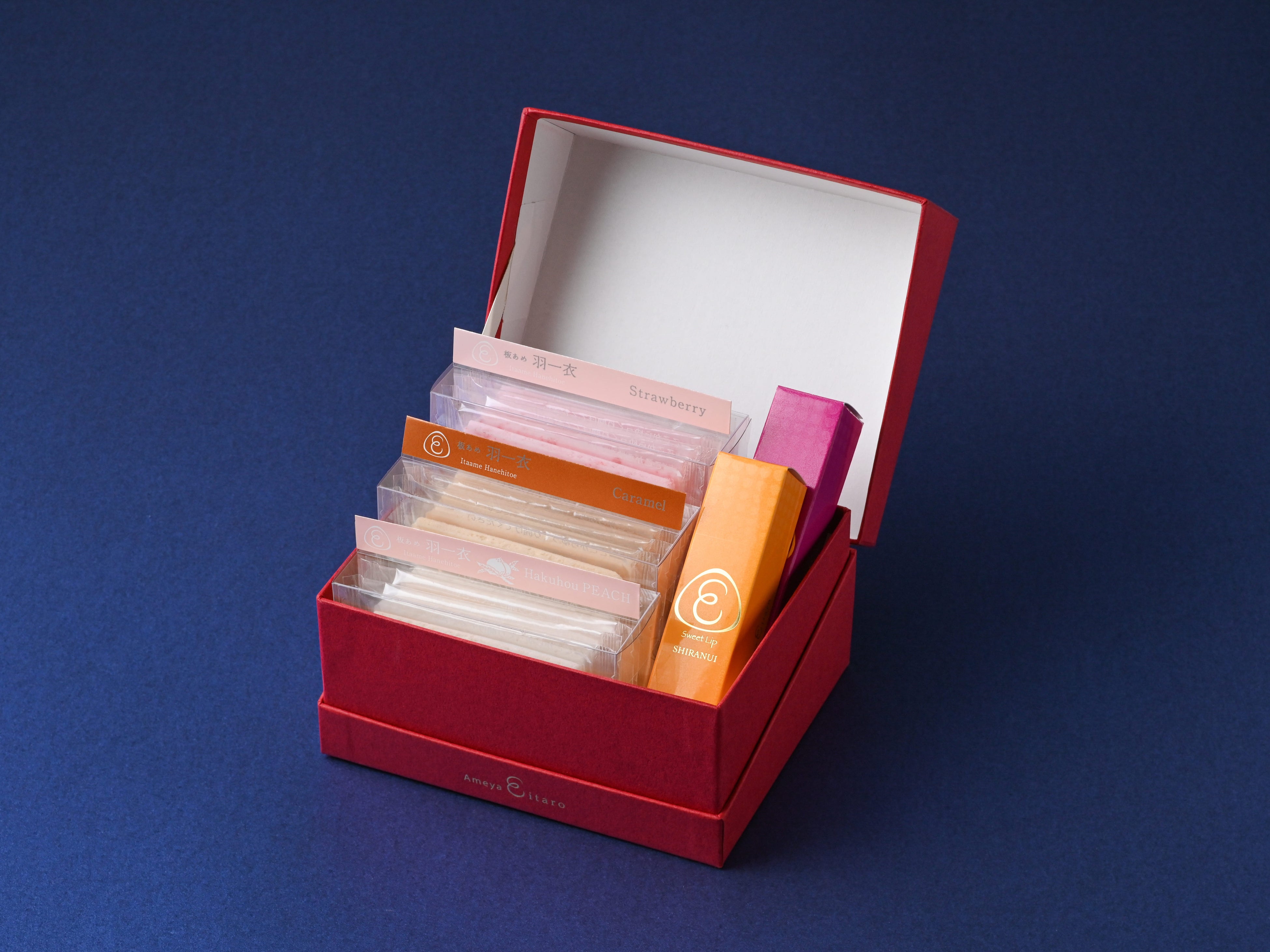 代表商品である「板あめ 羽一衣(はねひとえ)」や「みつあめ スイートリップ」をはじめ、クリスマス・ホワイトデーといった特別な時期は宝石をモチーフにした「スイートジュエル」など、受け取った方の気持ちが華やぎ、驚きや喜び溢れるギフトをご用意しています。