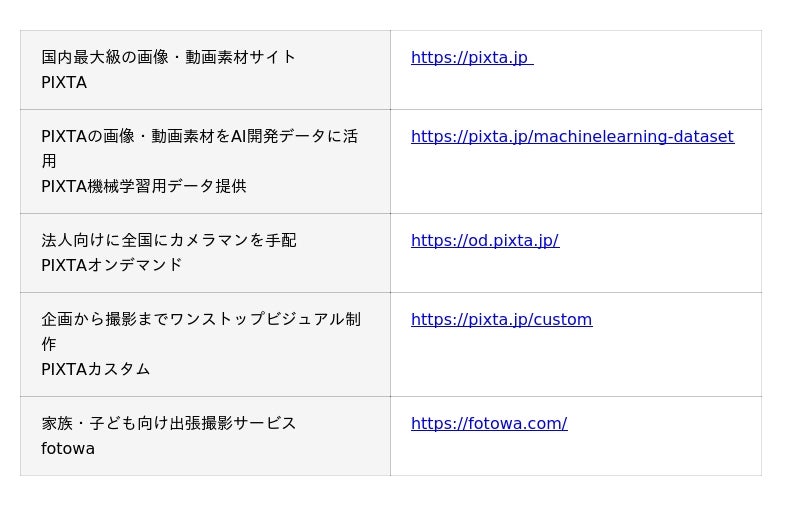 事業内容:デジタル素材のオンラインマーケットプレイス「PIXTA」の運営、法人向け出張撮影・カメラマンサービス「PIXTAオンデマンド」の運営、出張撮影プラットフォーム「fotowa」の運営