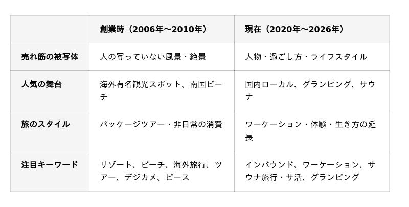 2006年のサービス開始から数年間は場所への到達を示す風景写真が中心でしたが、現在はどう過ごすかを表現する人物・ライフスタイル素材が主流となっています。売れ筋ビジュアルのこの変化は、旅行に求めるものが「非日常の消費」から「体験・ライフスタイルの表現」へとシフトしたことを示しています。