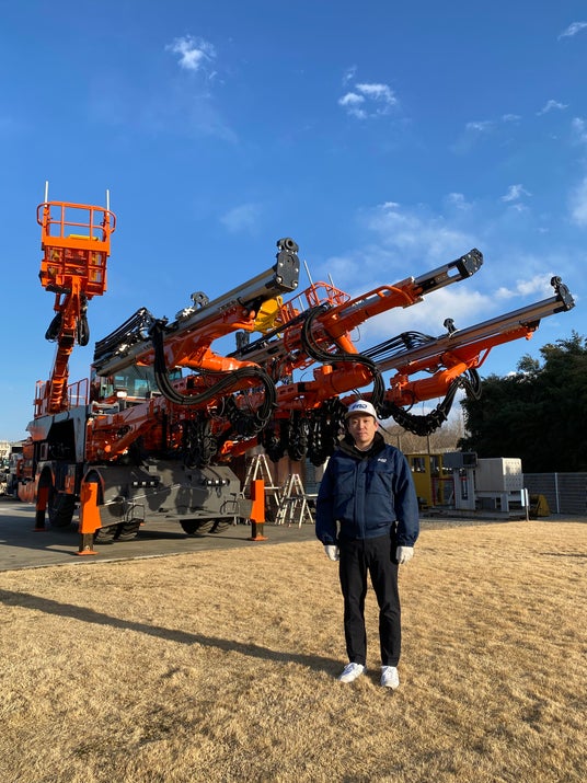 ドリルジャンボのオペレータデッキに乗って取材をする長崎さん(写真奥)