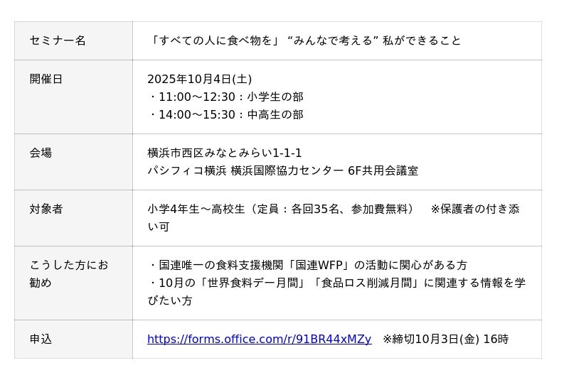 認定NPO法人国際連合世界食糧計画WFP協会(以下、国連WFP協会、神奈川県横浜市:安藤宏基会長)は、10月4日(土)に小学4年生から高校生を対象にしたセミナーを開催します。