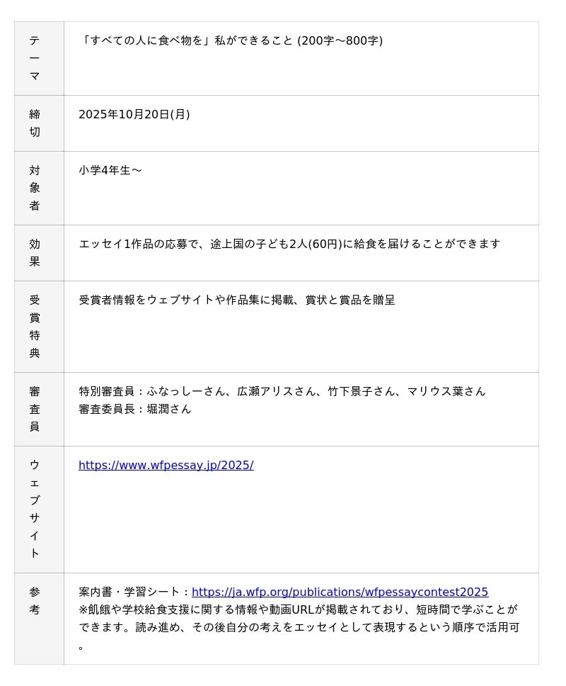 長引く紛争や自然災害、気候変動などの影響を受け、世界の5人に1人の子どもが栄養不良です。この問題を解決するため、国連WFPは学校給食支援を実施しています。本活動への寄付金を集める企画として、現在「WFPチャリティー エッセイコンテスト 2025」を開催しており、10月20日(月)まで “「すべての人に食べ物を」私ができること“ をテーマにしたエッセイを募集しています。本コンテストの関連企画として10月4日(土)に小学4年生から高校生を対象にしたセミナーを開催します。世界の飢餓問題と解決に向けた国連WFPの活動、途上国の子どもの栄養不良状態と支援策を学習後、自ら取り組めることを皆で考えます。小学4年生から6年生向けと中高生向けに2種類のプログラムを用意しています。中高生向けには、大学生が開発したカードゲーム “あなたが「飢餓の現場」にいたら!?” を体験します。