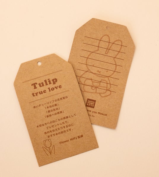 商品についているクラフト製の紙タグには「ミッフィー」が持っている花にまつわる花言葉がプリントされており、贈り主の気持ちを代弁するメッセージカードとして使用することができます。記載されている花言葉は、「ディック・ブルーナ」公式の「ミッフィーのお花屋さん フラワーミッフィー」に監修していただきました。また、商品の織りネームにも花言葉が刺繍されています。
