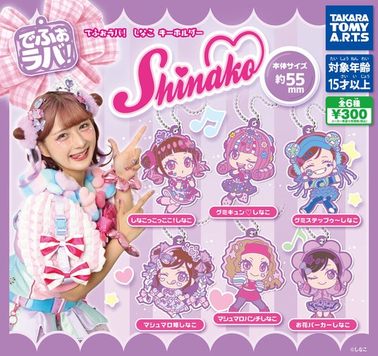 その『でふぉラバ!』にこのたび「しなこ」が仲間入りし、可愛らしいデフォルメアートとなって登場いたします。ラインアップは「しなこっこっここ!しなこ」「グミキュン(ハート)しなこ」「グミステップゥ~しなこ」「マシュマロ姫しなこ」「マシュマロパンチしなこ」「お花パーカーしなこ」の全6種類。各ラインアップのポージングやコスチュームは「しなこ」のミュージックビデオやSNS投稿からチョイスし、ファンなら馴染みあるデザインとなっています。ラバーの色もパープルをベースにした色味でバッグや小物などに付けても馴染みやすいおしゃれなカラーリングです。さまざまな表情も愛らしくデフォルメされた“でふぉラバ!しなこ”と一緒にスペシャルな毎日をお楽しみください。