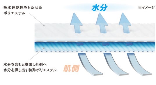 肌が当たる内側の部分は、水分を含むと膨張し水分を押し出す効果がある特殊なポリエステルを使用しています。外側は吸汗速乾性を持たせたポリエステルを使用。この異なる特性をもった2層のポリエステルの影響で、汗をかいた際に水分が肌から離れ外へ移動します。