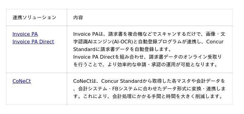 ※ PMCパートナー契約の締結によって、当社ブランドとしてConcur(R) Standardライセンスの販売が可能となったことに加え、中堅・中小企業のお客さまへConcur StandardライセンスとInvoice PA、Invoice PA Direct、CoNeCtなど、当社の連携ソリューションを一括してご提供できる体制が整いました。