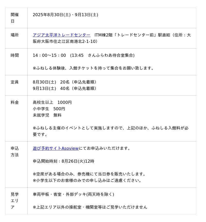 - 階段を利用する行程の都合上、車いす・ベビーカーでの見学はできません。 また、お一人では船内見学(階段の昇降を含む)が難しいお客様はお付き添いの方とご一緒のお申し込みが必要となります。お付き添いの方には階段の昇降時における介護や援助、および緊急時の誘導・援助などをお願いいたします。