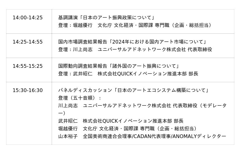 ユニバーサルアドネットワーク株式会社(代表取締役 川上尚志)は、令和7年度文化庁事業「アートエコシステム基盤形成促進事業」の運営事務局として、2026年2月26日(木)に文化庁主催シンポジウム「日本のアートエコシステム構築~国際競争力強化に向けて~」を、日本橋兜町の「QUICK Square」にて開催いたします。本シンポジウムでは、2024年の1年間における日本のアート市場の規模等を把握する国内市場調査「The Japanese Art Market 2025」の結果を初公開するほか、諸外国のアート振興に関する国際動向調査の報告、産官の専門家によるパネルディスカッションを実施します 。