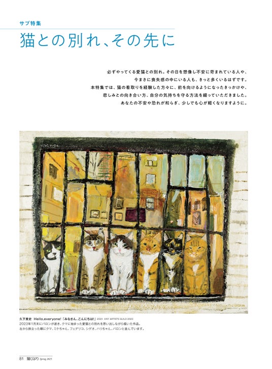 サブ特集では、いつか必ずやってくる愛猫との別れをテーマに、看取りの経験や悲しみとの向き合い方について取材しました。画家・久下貴史さんは絵を描くことで、芸人・ダーリンハニー長嶋さんは家族と思い出話をすることで、歌人・仁尾智さんは短歌を詠むことで喪失経験と向き合います。読者の方から寄せていただいたエッセイも、4ページに渡ってご紹介します。