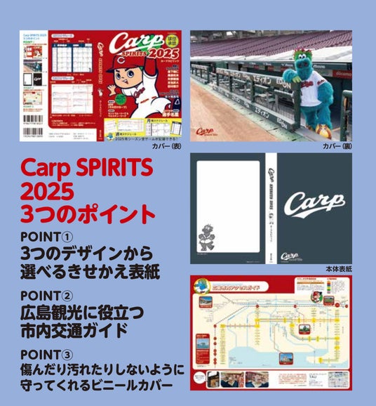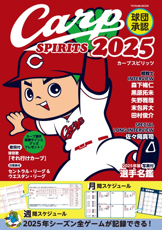 2025年シーズン全ゲームが記録できるファン必携の手帳『球団承認 Carp SPIRITS【カープスピリッツ】2025』が、辰巳出版より2025年3月14日に発売! 選手インタビューやスタジアムガイドなど、読み物としても情報満載の手帳となっています。