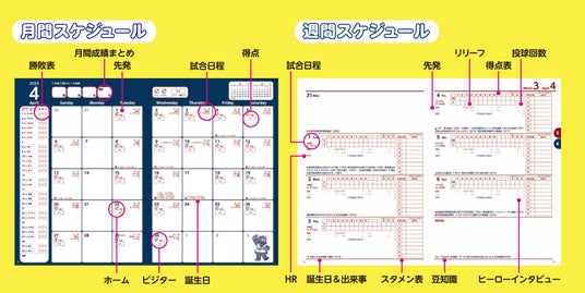 月間スケジュールでは、公式戦全スケジュール(対戦日、対戦相手、場所、時間)と勝敗がひとめでわかるレイアウトになっています。また週間スケジュールでは、得点表、スターティングメンバー、リリーフ、ヒーローインタビューなど細かく記録できるのが特長です。