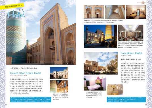 すべての都市で、最新観光スポット、遺跡、グルメ、ホテル情報を網羅。また、ウズベキスタンに行ったら必ず食べておきたいグルメやお土産などのカタログも入り、はじめてウズベキスタンを旅する人にとって、使いやすい仕様になっています。