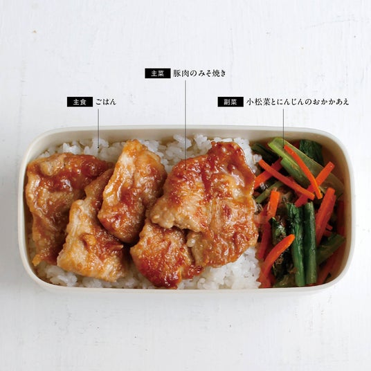 【豚肉のみそ焼き弁当】みそもごはんによく合う味つけ。副菜も分けて焼いているからおかかをあえたり、ごまをあえたり、それぞれ味つけを変えて楽しめます。