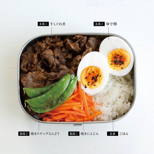 【牛しぐれ煮弁当】肉はしっかりしょうゆ味、副菜はさっぱり塩味。パカっと切った茹で卵に黒胡麻をふれば、見た目もおいしい。