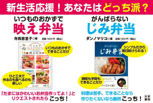 新生活応援、あなたはどっち派!? 手間も時間もできることだけの「じみ弁当」or いつものおかずにちょい足しで見た目重視の「映え弁当」。憂鬱になりがちなお弁当作りを助ける究極の2冊が同時発売です!
