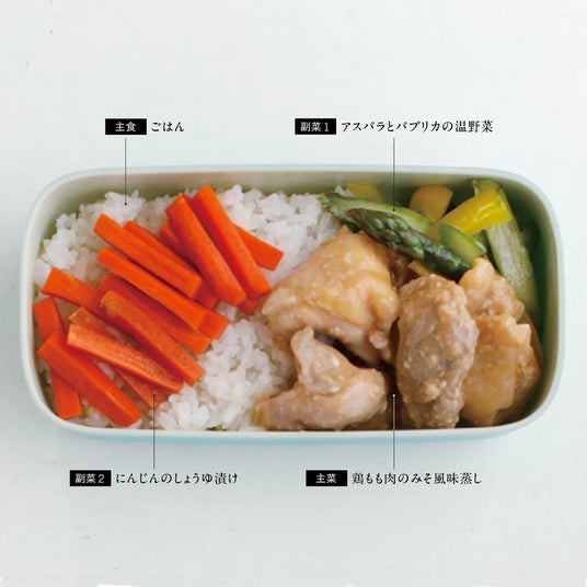 【鶏もも肉のみそ風味蒸し弁当】メインの鶏肉はみそ、野菜はしょうゆで一夜づけに。季節の温野菜はレンチンでラクラク。前夜につけるだけのお弁当も掲載しています。