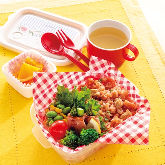【チキンライス】電子レンジで作ったチキンライスはワックスペーパーを下に敷くだけで気分UP! お弁当箱へのケチャップの色移り防止にもなって一石二鳥!