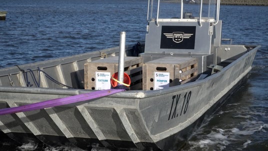 リリースポイントの海岸まで船で曳航される。同時期に保護された「ポンポン」も一緒にリリースされる/(C)Tonton Train