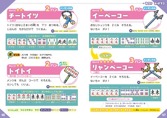 『5さいからはじめるマージャン』は、かわいいイラストをふんだんに盛り込み、やさしい言葉でマージャンの基本から点数計算までわかるように制作された本です。漢字には全て読み仮名が振ってあり、平仮名と片仮名がわかれば読めるようになっています。ゆったりとしたデザインで、色を使い分けながら基本がビジュアルで伝わるような作りになっています。例えば、初心者がつまずく34種類のマージャン牌の区別や、ゲームのベースになる「メンツ」と「アタマ」が一目でわかります。