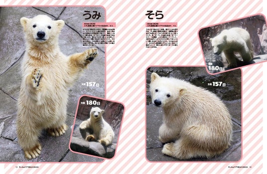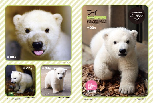 ホッキョクグマの子育ては2年近くに及びますが、子どもの成長は早く、うみ・そら・ライともにぐんぐん成長中。『ホッキョクグマまるごとBOOK』には、3頭の貴重な赤ちゃん時代の写真が多数収録されています。