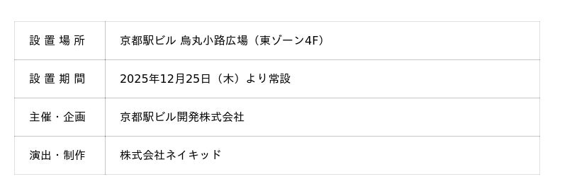 京都駅ビル開発株式会社(京都市下京区、代表取締役社長:橋本 修男)は、2025年12月25日より、京都駅ビル4F烏丸小路広場に、株式会社ネイキッド(本社:東京都渋谷区、代表:村松亮太郎)によって制作された「KYOTOモニュメント」を設置したことをご報告いたします。