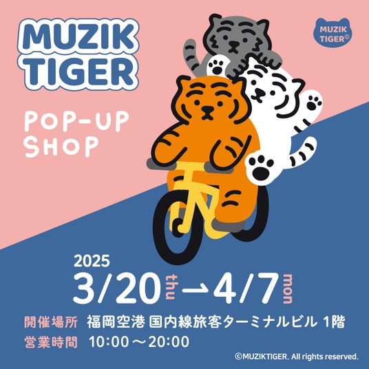 株式会社マリモクラフト(本社:東京都江東区)は福岡空港内に新たにオープンするキャラクターグッズPOPUP専門店「キャラコレ」にて『MUZIK TIGER』のポップアップストア「MUZIK TIGER POP-UP SHOP」を3月20日(木)から4月7日(月)までの期間限定で開催いたします。