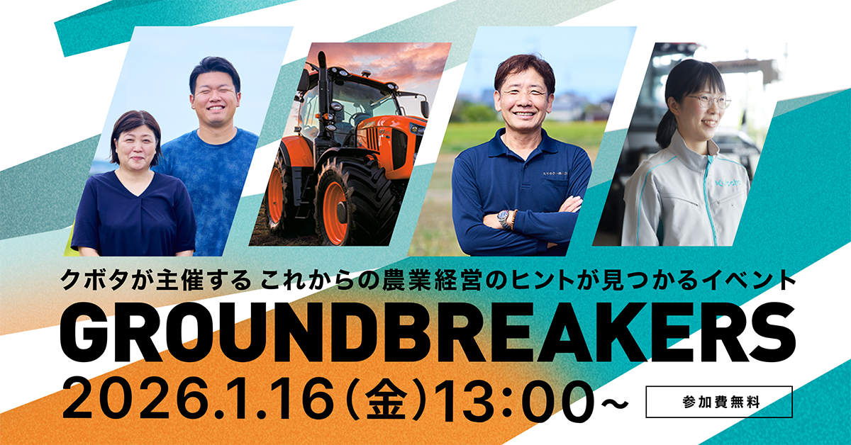 株式会社クボタ(本社:大阪市浪速区、社長:北尾裕一、以下「当社」)は、農業経営者や農業関係者とともに日本農業の現状とこれからを考える機会のひとつとして、オンラインイベント「GROUNDBREAKERS」を2026年1月16日に開催します。当社は農業従事者をはじめとするお客様に寄り添いながら、日本農業の活性化に貢献してまいります。