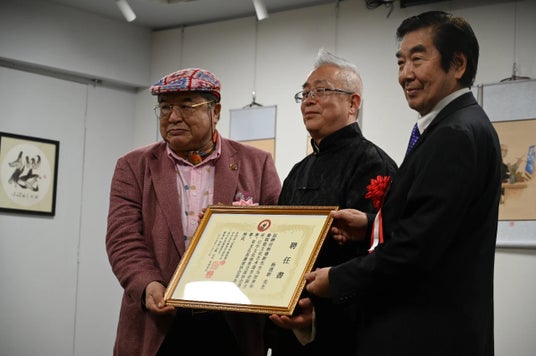 その後日中文化体育交流協会理事である芳賀元鎬氏から楊徳新氏に世界華僑連盟文化芸術委員会副主任の称号を授与し、その芸術的功績を称えました。