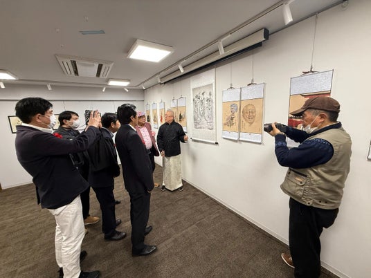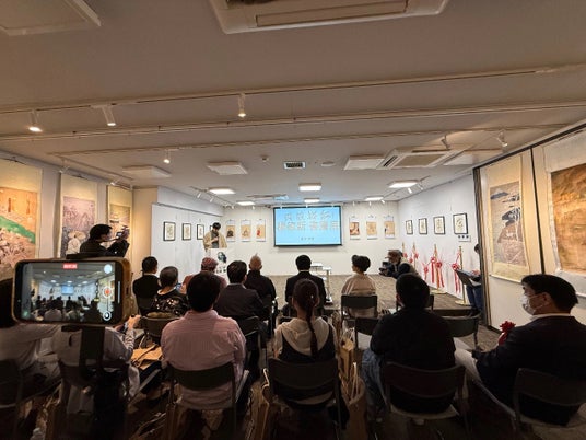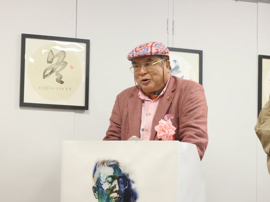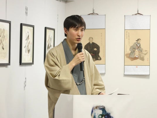 協賛団体代表である日中文化体育交流協会の芳賀元鎬氏は、日中文化交流の重要性について語り、楊徳新氏の作品が両国の文化理解を深める一助となることを期待すると述べました。