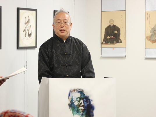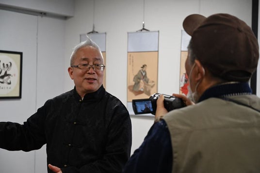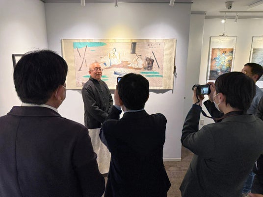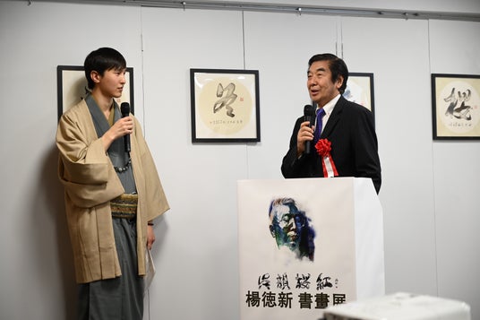 今回のメインゲストである楊徳新氏は、自身の創作理念や展覧会への感想を語り、「私は中国蘇州の書画者として、東京でこのような素晴らしい機会をいただき、大変光栄に思います。私の作品は、水墨の融合を通じて、自然と生命の本質を探求するものです。今日の展示が、日中両国の文化理解を深める一助となれば幸いです」と述べました。
