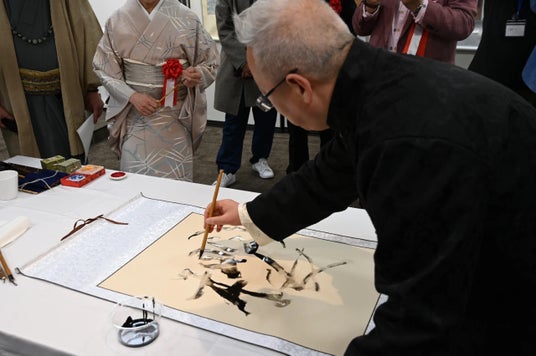 関係者からの祝辞が述べられた後、会場では楊徳新氏と松岡福羅氏が「雲水書体」を即興で創作し、会場は大きな拍手に包まれました。両者の芸術的協力が、日中文化の美しい調和を表現しました。