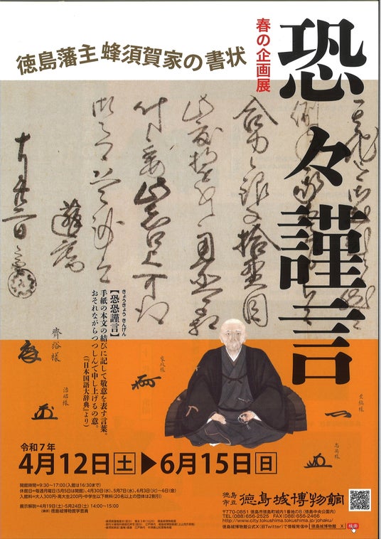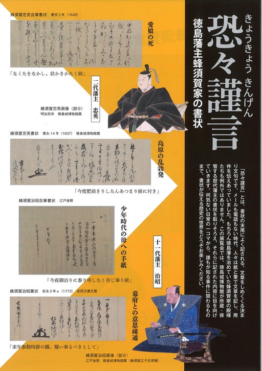 「恐々謹言」とは、書状の末尾によく記される、文章をしめくくる決まり文句です。メールも電話もない時代、人々は紙と筆で文章を記し、用件を伝えあっていました。もちろん徳島藩を治めていた蜂須賀家の殿様たちも例外ではありません。この展覧会では、徳島城博物館が所蔵・保管する歴代藩主の書状を取りそろえ、それらに記された内容に目を向けていきます。何気ない日常の一コマから、誰もが知る事件に関わるものまで、書状が伝える歴史の世界をどうぞお楽しみください。