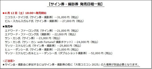 ニコラス氏、ビル氏のサイン券・撮影券は、2025年4月12日(土)18:00よりチケットぴあ及びハリコンサイトの両サイトにて発売開始となり、ニコラス氏のサイン券・撮影券は31,000円(税込)で、ビル氏のサイン券・撮影券は27,000円(税込)でお買い求めいただけます。