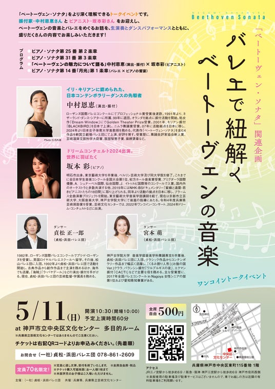 5月31日・6月1日に兵庫県立芸術文化センターで行われる「貞松・浜田バレエ団『ベートーヴェン・ソナタ』」公演に先立ち、5月11日(日)に神戸市立中央区文化センター 多目的ルームにて関連企画「バレエで紐解くベートーヴェンの音楽」を開催します。