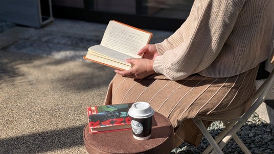 中庭にアウトドアチェアを設置し、購入した本をゆっくり楽しめる空間をご用意。