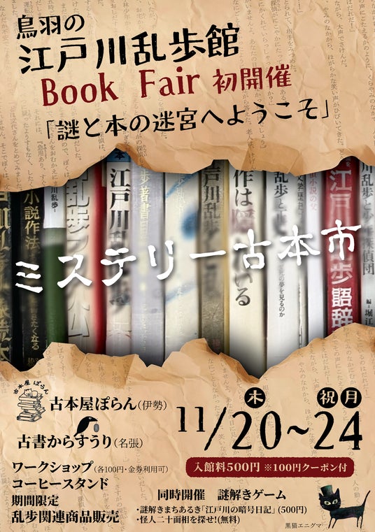 鳥羽市にある「江戸川乱歩館」では、2025年11月20日(木)から24日(祝・月)までの5日間、「江戸川乱歩館ブックフェア ミステリー古本市」を開催します。