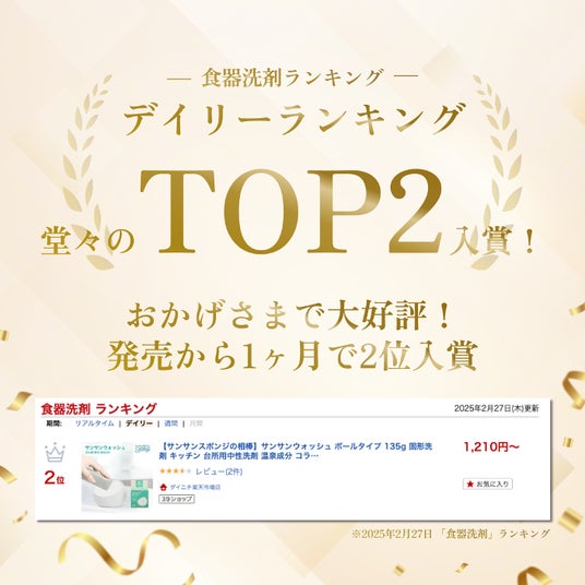 サンサンウォッシュは発売からわずか2週間で先行発売分が完売。再発売後は、液体洗剤が一般的とされる昨今において、固形洗剤のサンサンウォッシュが楽天市場の食器洗剤ランキングにおいて第2位を獲得。これは、50年に渡り固形洗剤を売り続けてきたダイニチにとって史上初の快挙です。サンサンスポンジに続く、食器用洗剤のフラッグシップ開発という挑戦において悲願を達成しました。