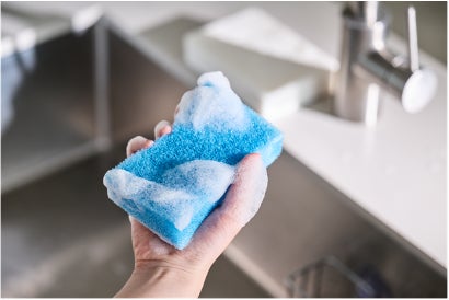 ダイニチ・コーポレーションは創業から、食器洗い用固形洗剤の製造販売を行っています。製造から販売を行う中で、固形洗剤と相性の良いスポンジを研究し、高品質ポリウレタンを使用した、従来のスポンジの概念を覆す「サンサンスポンジ」が生まれました。半年以上使えるほど丈夫で長持ちなので、ごみの削減に。