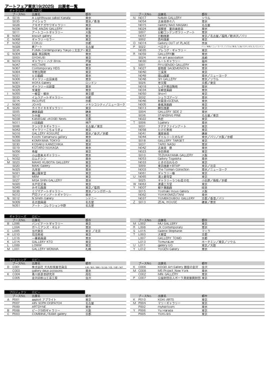 小山登美夫ギャラリー、シュウゴアーツ、MAHO KUBOTA GALLERY、TARO NASU、カイカイキキギャラリー、ケンジタキギャラリー等をはじめとした日本の現代アートシーンを牽引するギャラリーらに加え、ペロタンなど海外のギャラリーらが参加する「ギャラリーズ」においては、日本のアートシーン並びにアートマーケットを展望する機会となるように目指します。