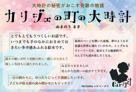 大時計の町、カリジェで起こるちょっと不思議で心あたたまる物語。絵本作家・ぬまのうまきさんが美しく幻想的なイラストで描きました。
