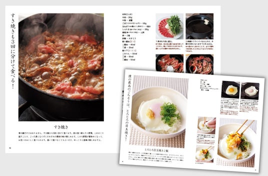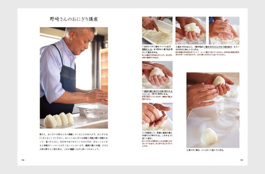 本書では、野崎さんがご自宅で実際に食べている好きな料理もご紹介。ベスト料理は「とろとろ目玉焼きご飯」。卵白が固くならないようにやさしく加熱し、ご飯にのせて混ぜて食べるというもの。「すきやき」にもこだわりがあって、まず肉を堪能したら、次に野菜を食べて口内をリフレッシュし、また肉、野菜というように交互に食べていきます。そして、何よりも野崎さんが好きなお米の代表料理「おにぎり講座」も必見です!