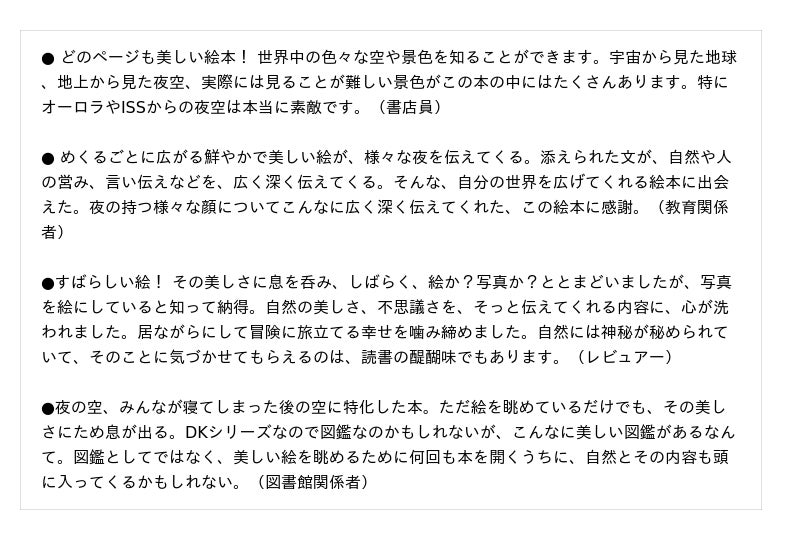 星や月、宇宙だけでなく、夜に活動する動物や自然現象、すい星の歴史や世界の年越し文化など、幅広く紹介。また、緻密なイラストとデザインが魅力。ページをめくるごとに、美しい夜の世界が広がり、小さな子どもでも視覚的に楽しみながら理解を深められる構成です。