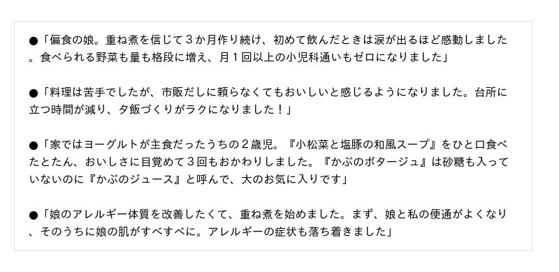 重ね煮スープを試してくださったママ・パパから喜びの声がたくさん届いています!!(一部抜粋)