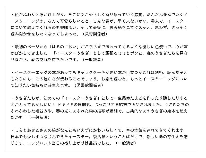 巻末には、イースターの由来や意味をやさしく解説した「イースターって なあに?」〈おうちの方へ〉を収録。監修は指昭博(宗教学・英国史学者)。読んだあとも、物語の余韻とともにイースター文化への理解が自然と深まるでしょう。