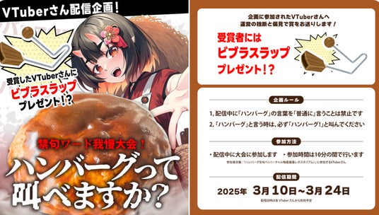 今回は3社のハンバーグ商品を取り扱いさせていただき、VTuberが生配信を通して視聴者に商品の魅力を発信する企画になっています。VTuberが配信で7種類のハンバーグ商品の食べ比べを行い、食レポを行う中で視聴者に商品の味や特徴などを伝えます。