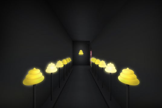 三角形の筐体をのぞきこむと、まるで万華鏡のように、うんことあなたが増殖。その様子は壁いっぱいに投影され、うんこカワイイ世界が広がっていきます。