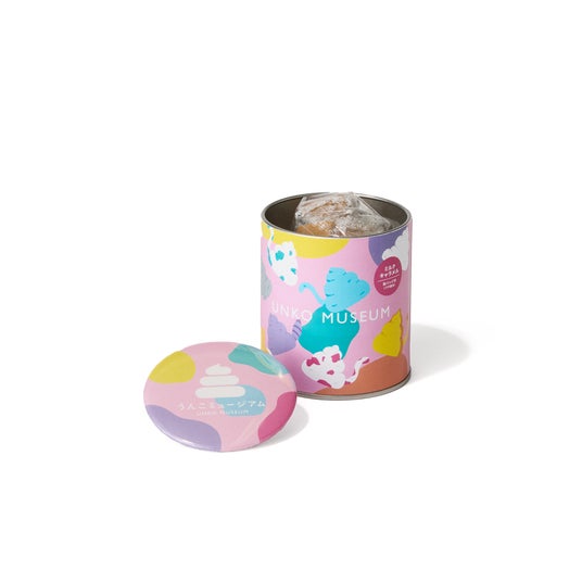 うんこミュージアムの大人気コンテンツ「うんこシャウト」や「うんこ動物」がデザインされたおいしいミルクキャラメルです。可愛い缶バッジ付きです。